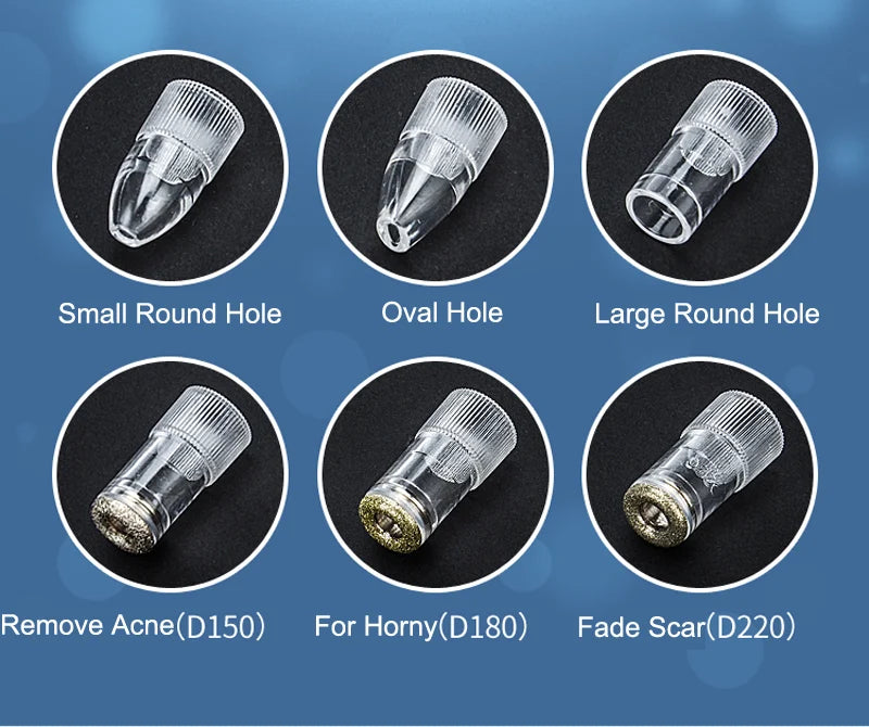 Diamond dermabrasion makes use of a patented diamond dermabrasion tube, combined with inlaid diamond particles of different thickness of diamond carved heads, and rub back and forth by the way, and with instruments to control the intensity of suction vacuum suction, the skin worn a shallow layer is a non-invasive,shallow dermabrasion physical nature.