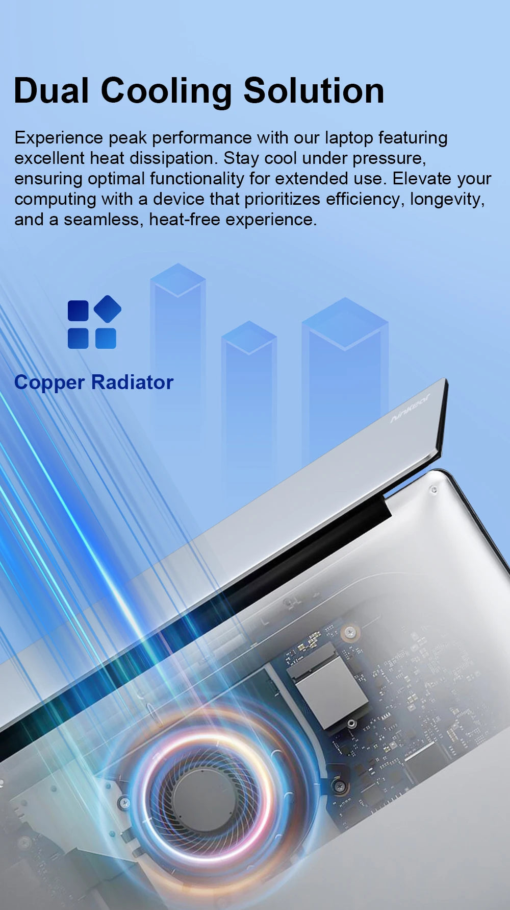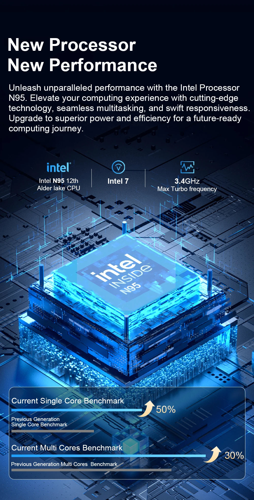 The computer is equipped with the N95 processor of Intel® Alder Lake-N architecture. With a powerful heart of 4 cores and 4 threads, it can easily cope with daily office, learning software, multitasking and light graphic design needs, ensuring that whether it is complex document editing, smooth video conferencing, or high-definition video playback and light game entertainment, it can be done with ease, making learning and work more efficient.