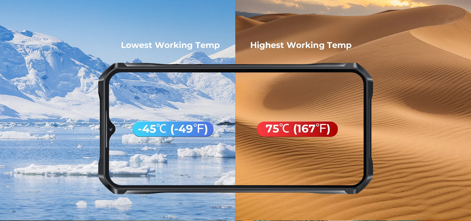 Certified by IP68 rating, this smart rugged phone can be immersed in 1.5 meter water for up to 30 minutes. It's also IP69K certified to withstand high-pressure water jets, and MIL-STD-810H certified to withstand a 1.5 metre drop.