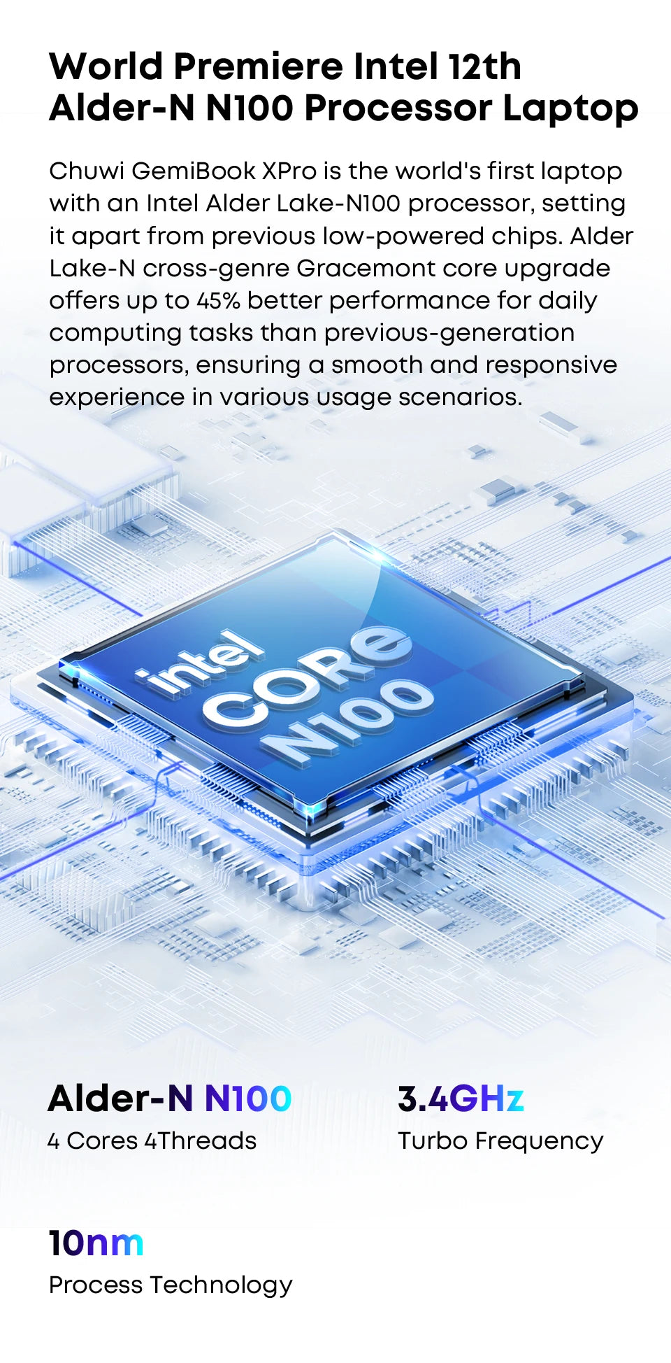 Brand: CHUWI Model: GemiBook XPro(N100) OS: Pre-installed Windows 11 CPU: Intel N100 Core: Quad Core, Up to 0.8GHz-3.4GHz GPU: Intel UHD Graphics for 12th Gen Intel Processors Battery: 38Wh(7.6V/5000mAH)  |