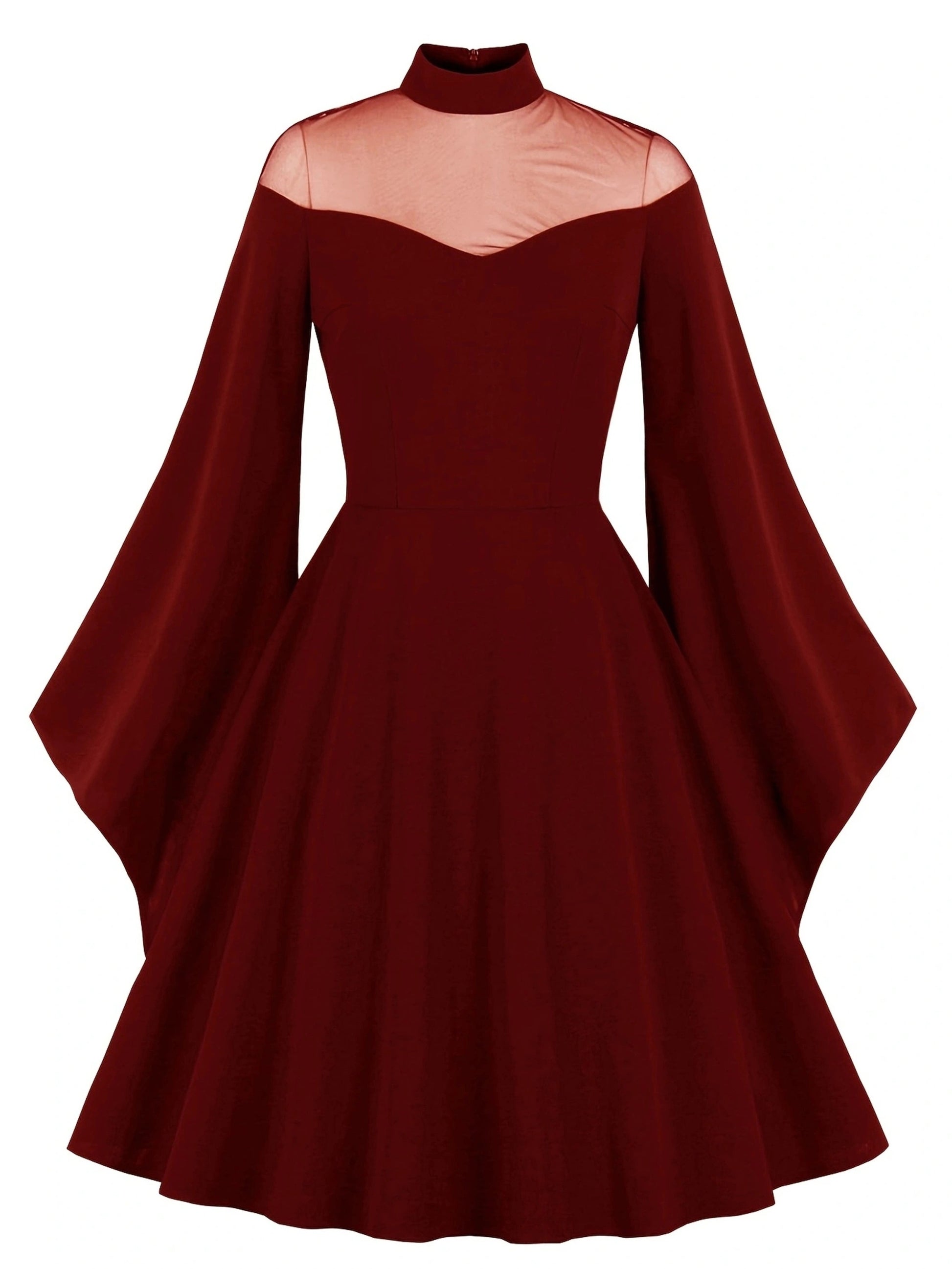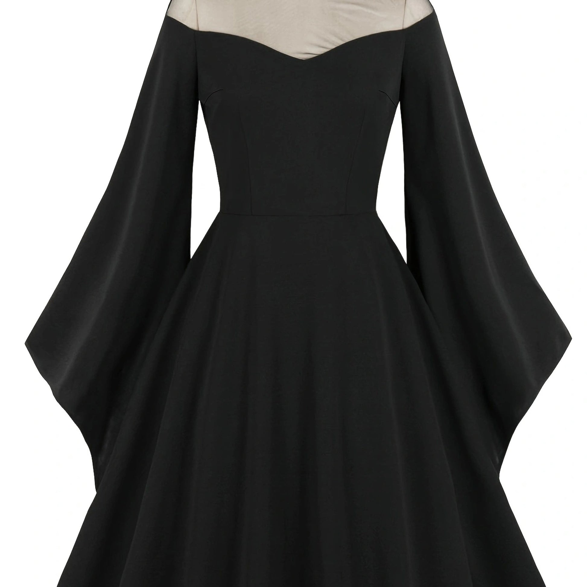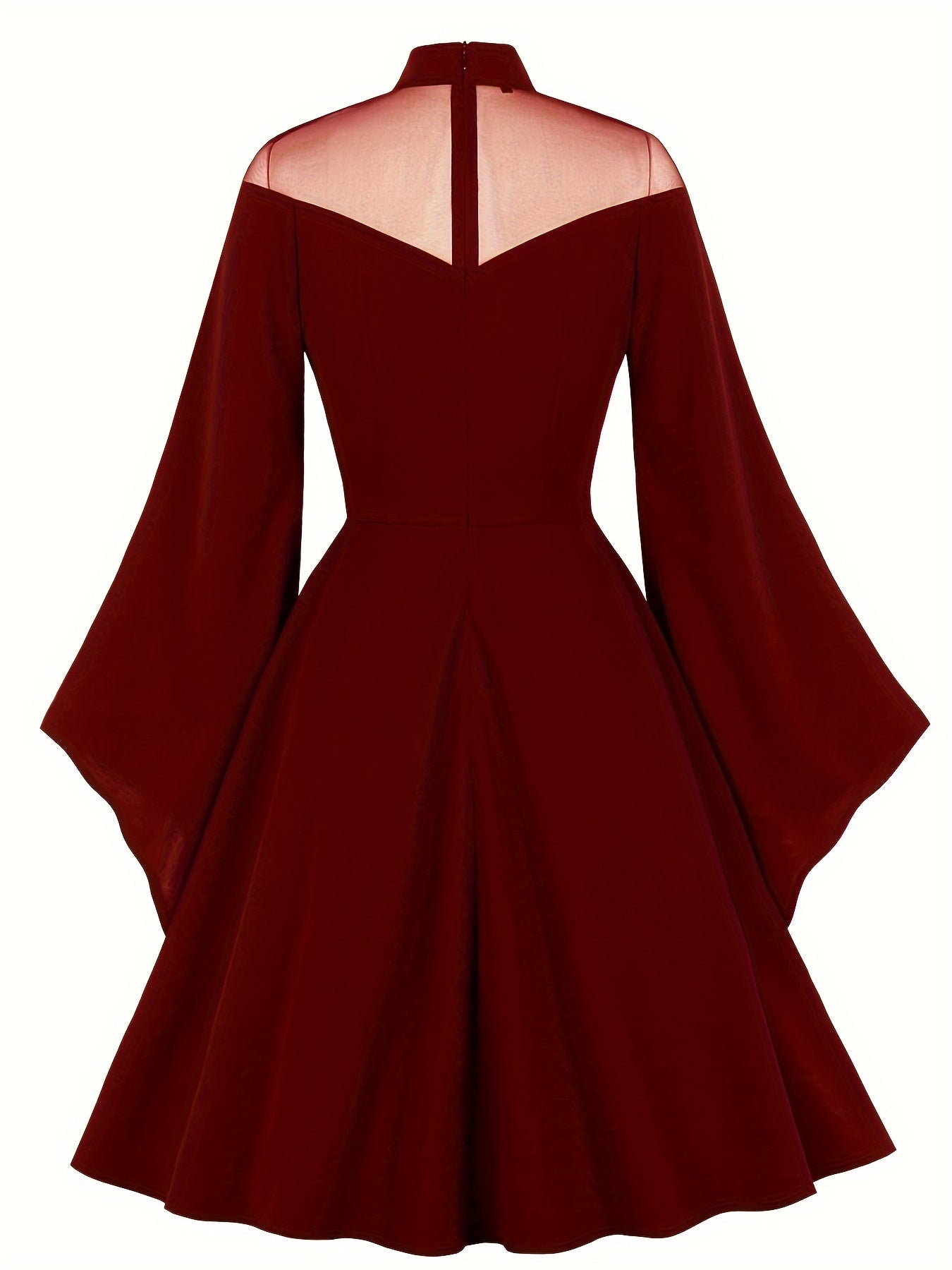 Halloween Black Queen Mesh Trumpet Sleeve Dress, Solid Retro Zip Back Dress, Women's Clothing