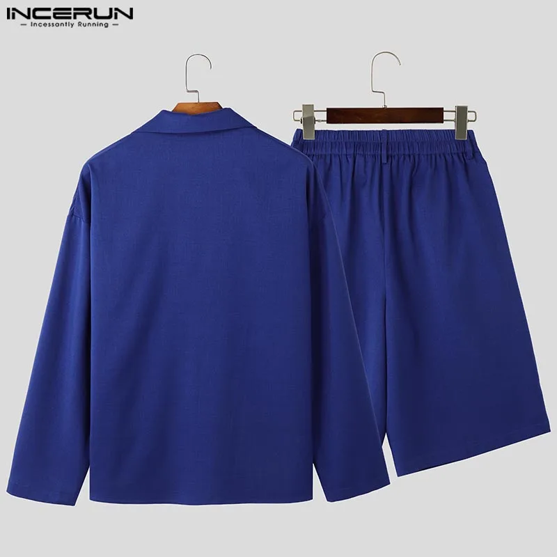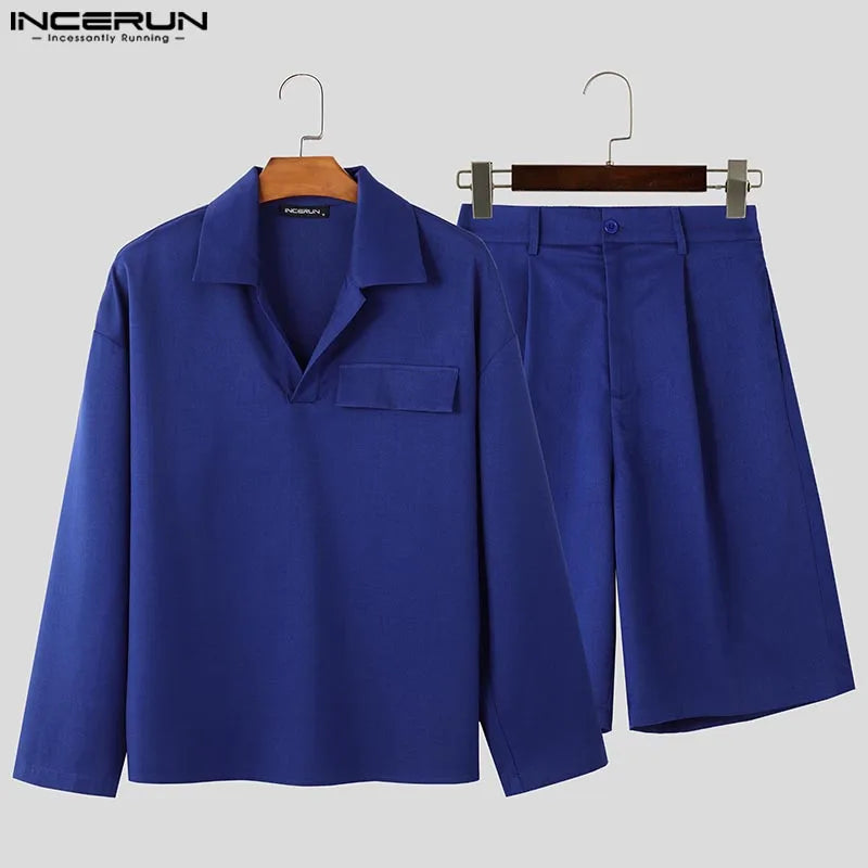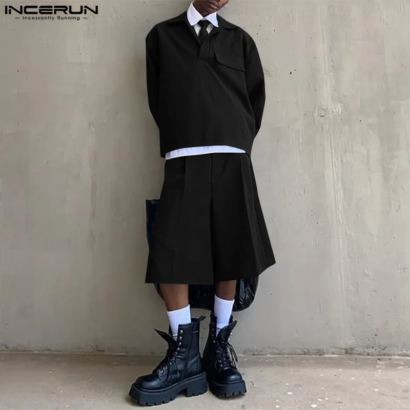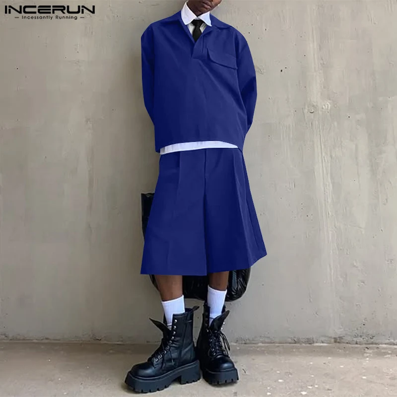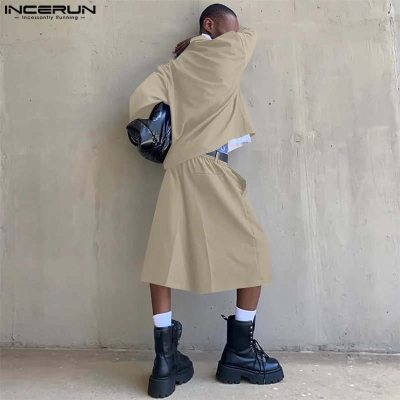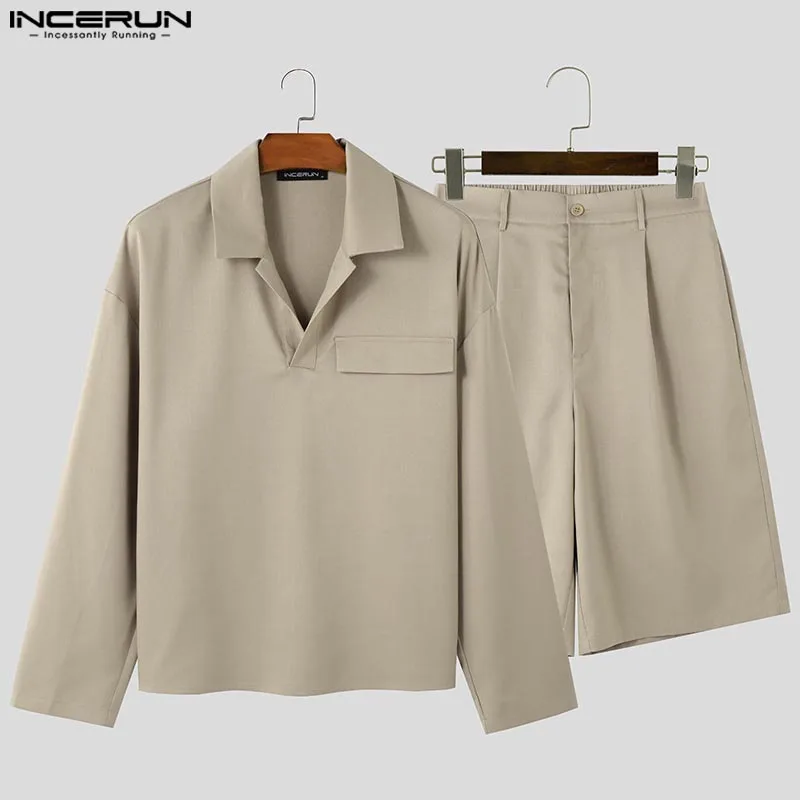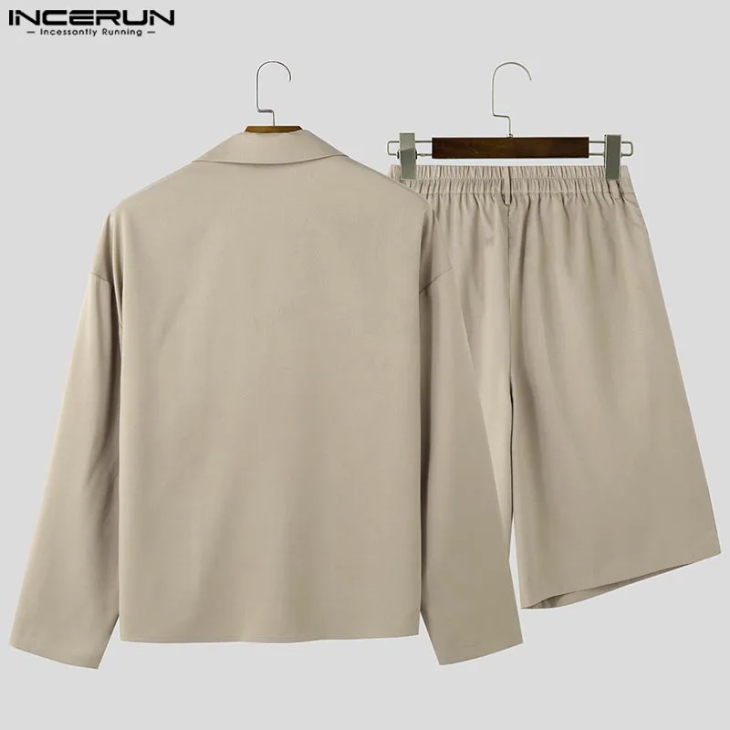 INCERUN 男士套裝純色時尚翻領兩件式西裝 2 件長袖上衣 T 卹短褲街頭潮流男裝