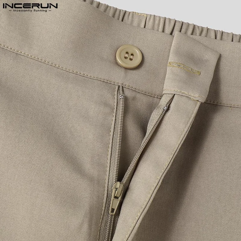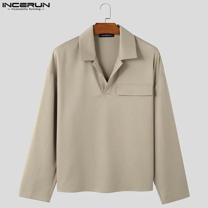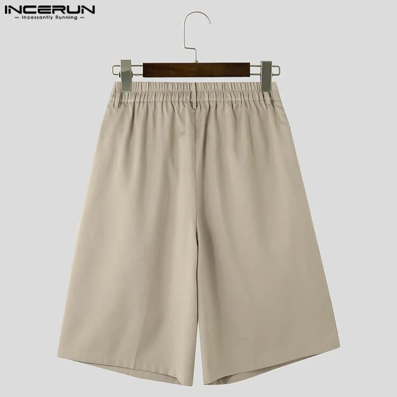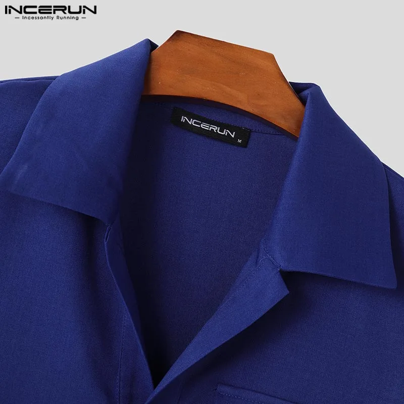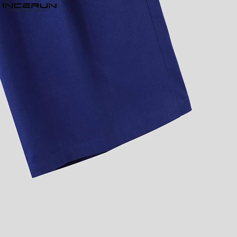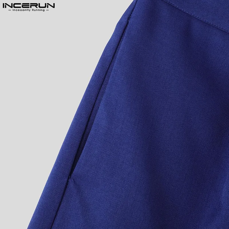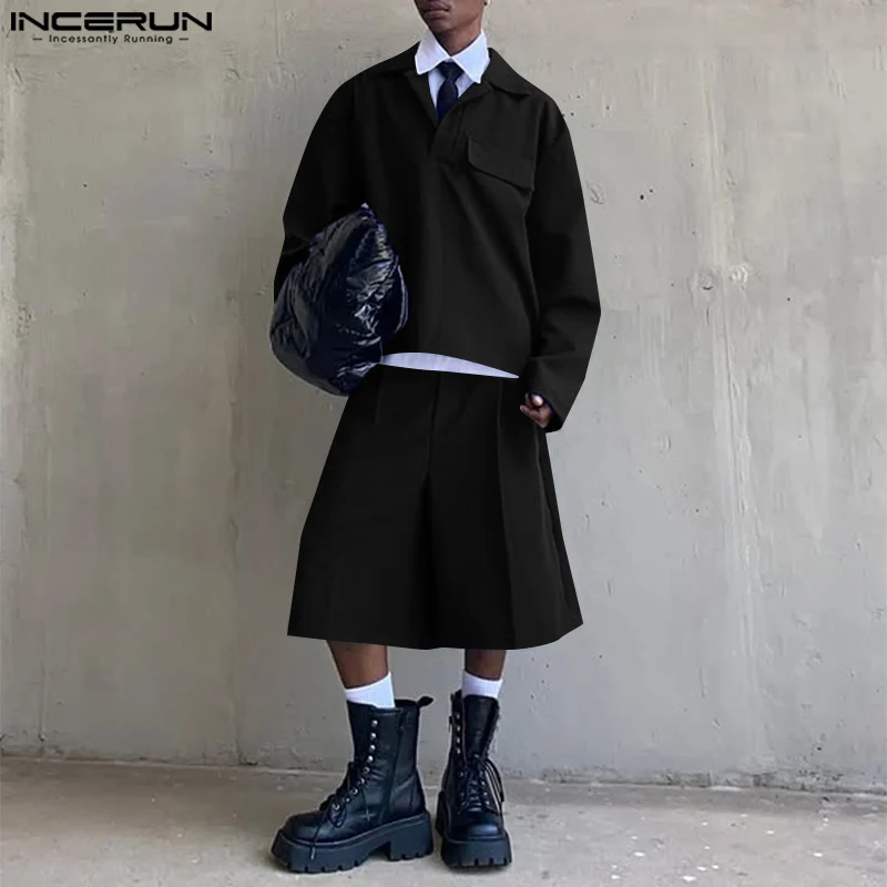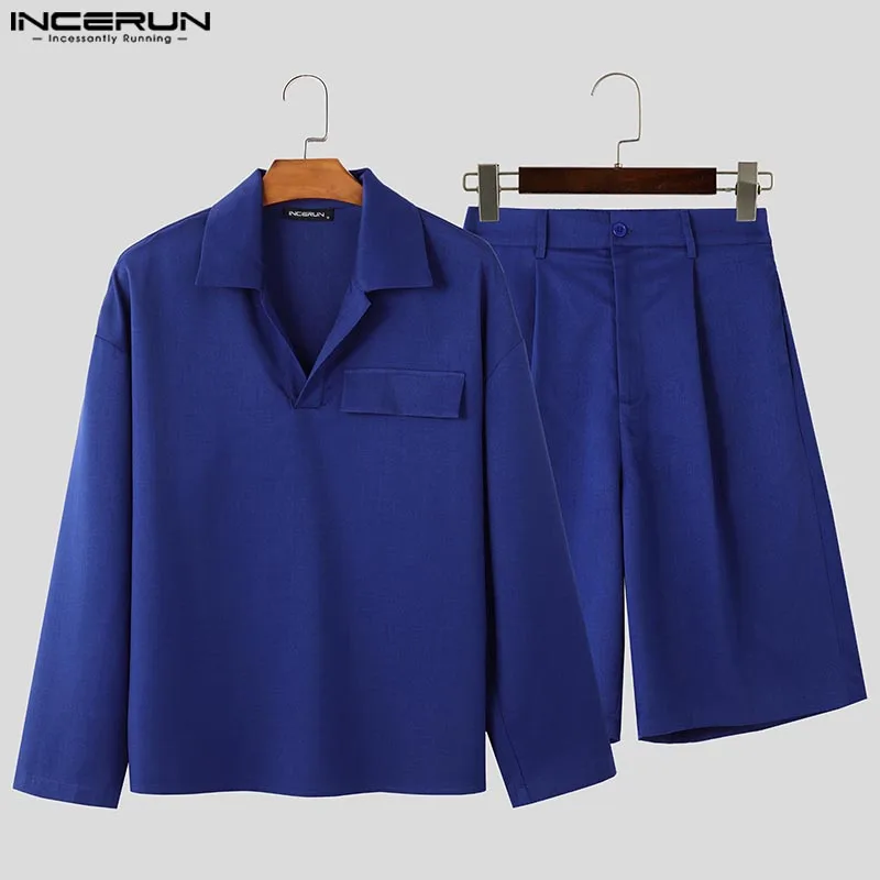 INCERUN 男士套裝純色時尚翻領兩件式西裝 2 件長袖上衣 T 卹短褲街頭潮流男裝