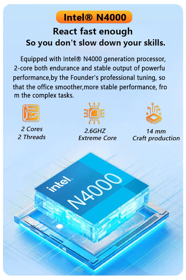 [Intel processor]: Intel Celeron N4000 Dual Core CPU, low power consumption and high performance.