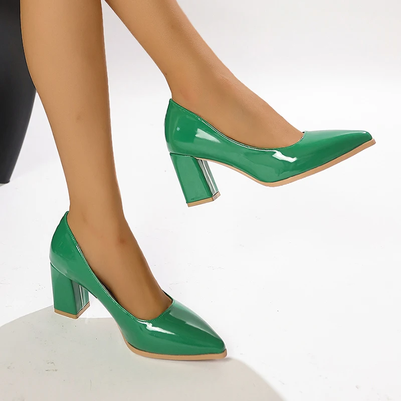 Women Shoes Green Chunky Heel High Heels Sexy Pointed Toe 7Cm Pumps Wedding Dress Shoes Rubber Bottom High Heels Ladies
