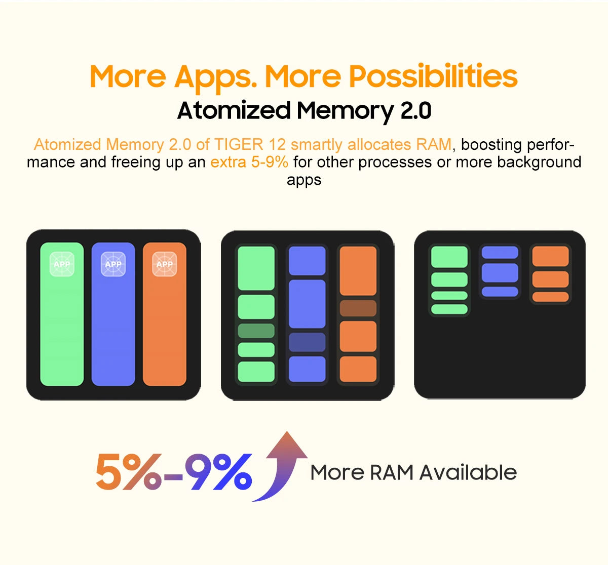 Atomized Memory 2.0 of TIGER 12 smartly allocates RAM, boosting performance and freeing up an extra 5-9% for other processes or more background apps.