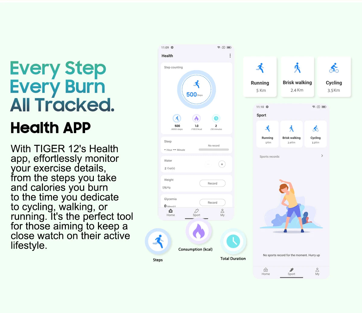 With TIGER 12's Health app, effortlessly monitor your exercise details, from the steps you take and calories you burn to the time you dedicate to cycling, walking, or running. It's the perfect tool for those aiming to keep a close watch on their active lifestyle.