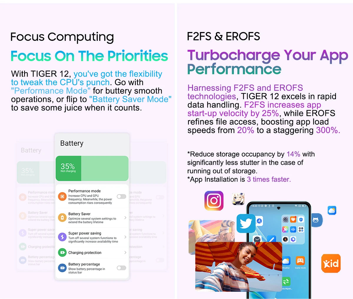 Harnessing F2FS and EROFS technologies, TIGER 12 excels in rapid data handling. F2FS increases app start-up velocity by 25%, while EROFS refines file access, boosting app load speeds from 20% to a staggering 300%.