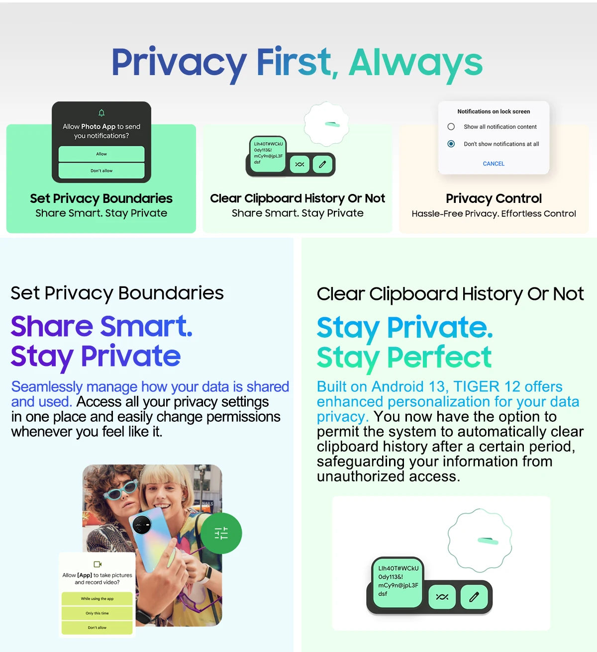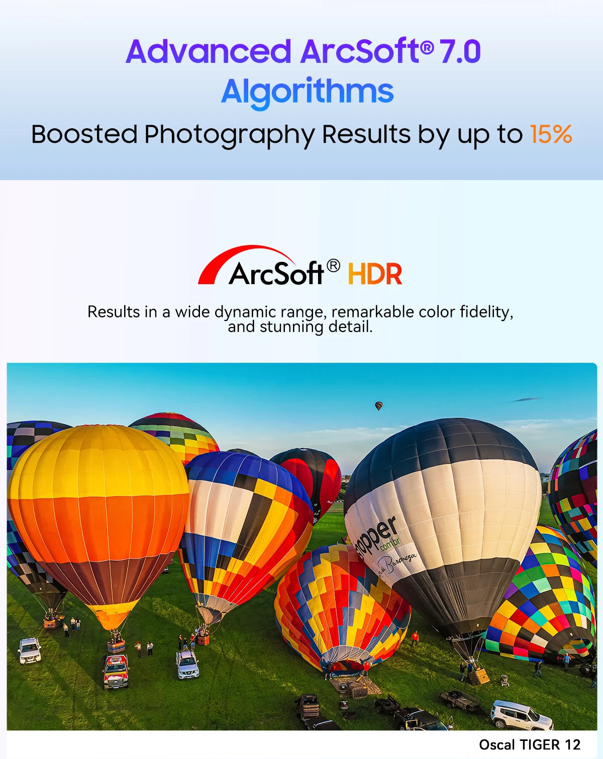 Often feel that the photos you take look stiffand rigid? How can you capture eye-catching images that are always full of vitality and liveliness? Try out the ultra-fast, super-clear TIGER 12 equipped with 13+ 64MPcameras. Its unique Tetrapixel technology captures bright, vivid images every time. Meanwhile, the smart-ISO adjusts photos intelligently under different lighting conditions, ensuring every photo you take is rich in detail and color.