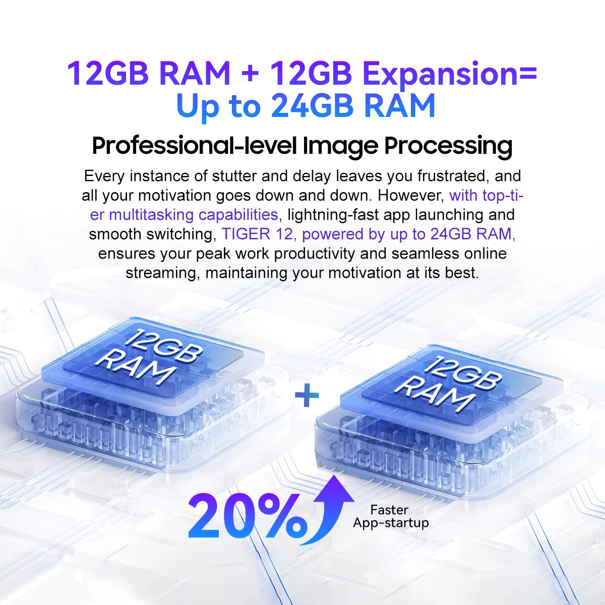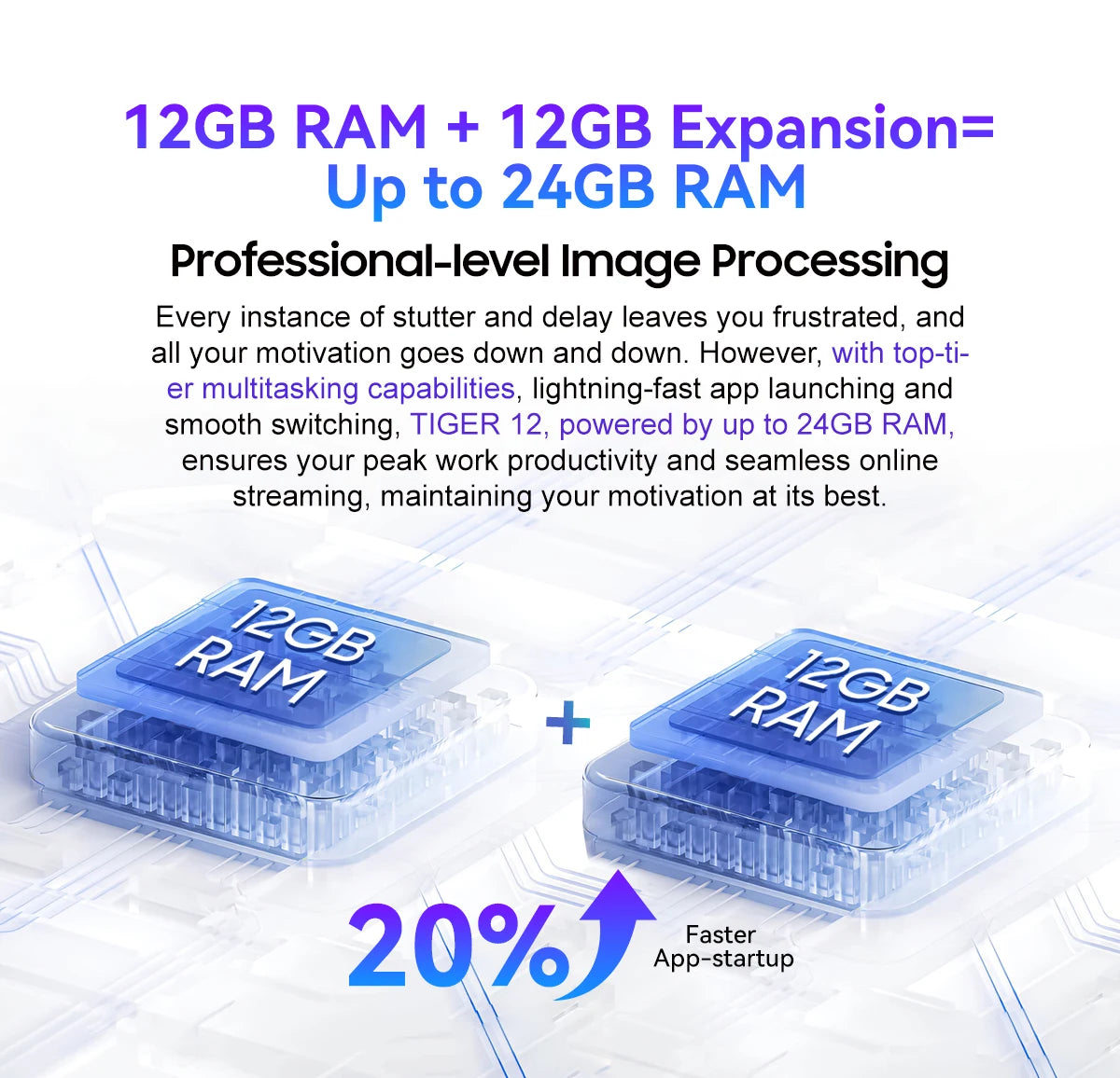 Every instance of stutter and delay leaves you frustrated, and all your motivation goes down and down.However, with top-tier multitasking capabilities, lightning-fast app launching and smooth switching,TIGER 12, powered by up to 24GB RAM, ensures your peak work productivityand seamless online streaming, maintaining your motivation at its best.