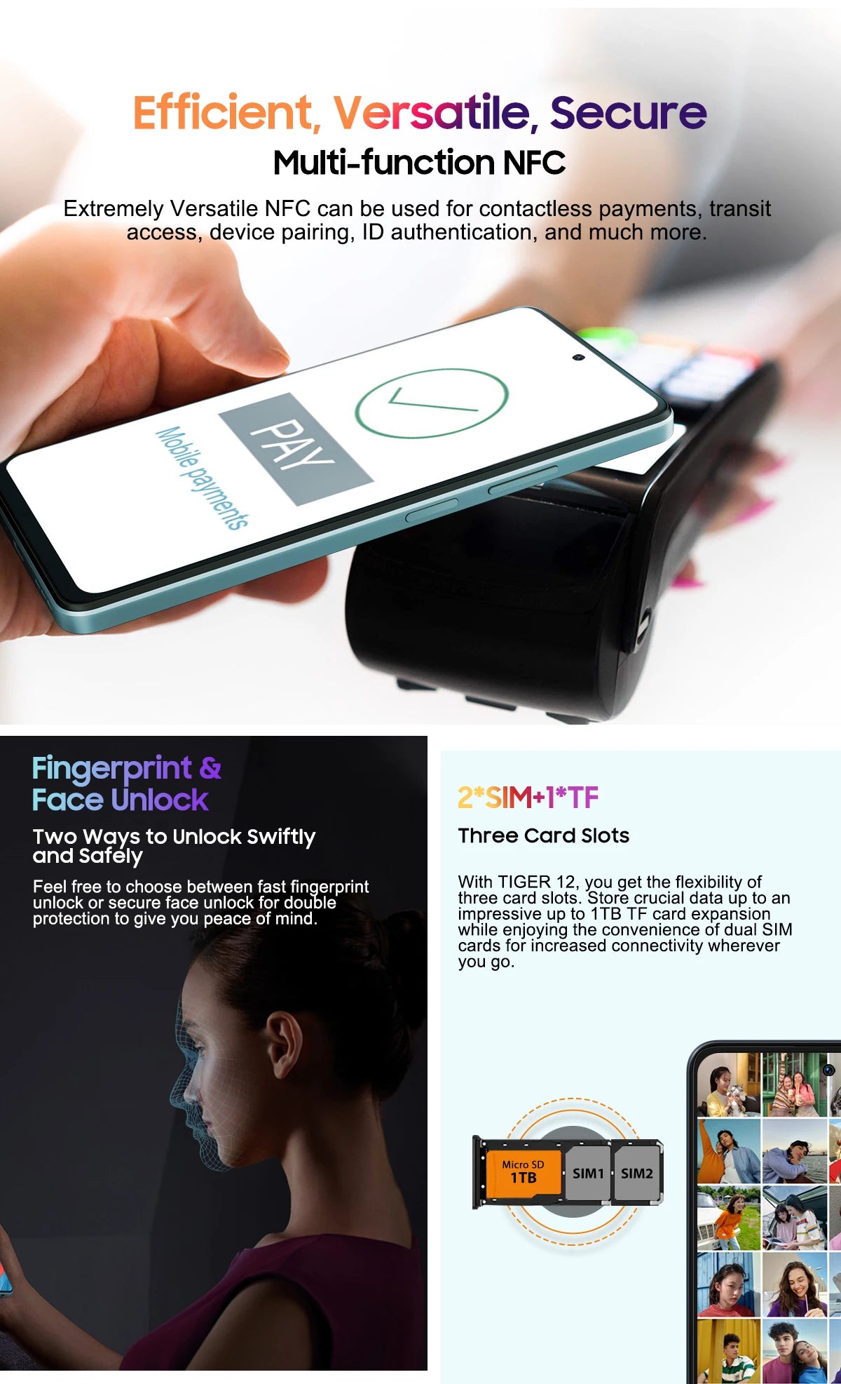 Still frequently deleting your memorable photosjust to make space for downloading large-memory games? With Oscal TIGER12backed by256GB ROM and expandable up to 1TBTF card, work through storage worriesthoroughly. Bid farewell to the hassle of clearing space and welcome the freedom of unlimited downloads.