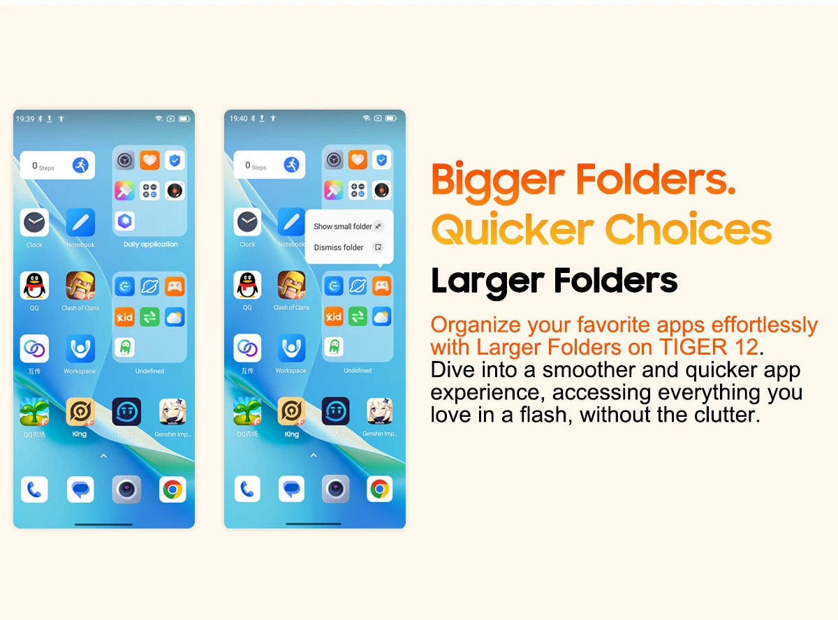 Organize your favorite apps effortlessly with Larger Folders on TIGER 12. Dive into a smoother and quicker app experience, accessing everything you love in a flash, without the clutter.