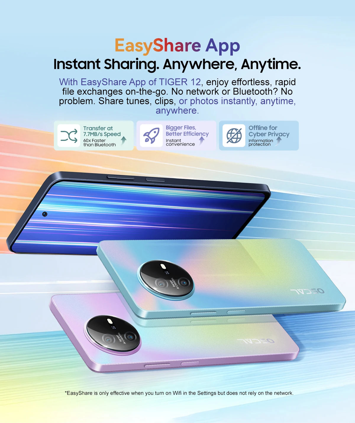 With EasyShare App of TIGER 12, enjoy effortless, rapid file exchanges on-the-go. No network or Bluetooth? No problem. Share tunes, clips, or photos instantly, anytime, anywhere.