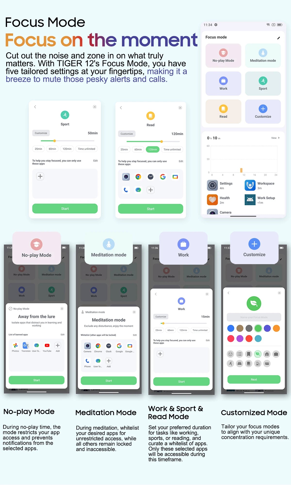 Cut out the noise and zone in on what truly matters. With TIGER 12's Focus Mode, you have five tailored settings at your fingertips, making it a breeze to mute those pesky alerts and calls.