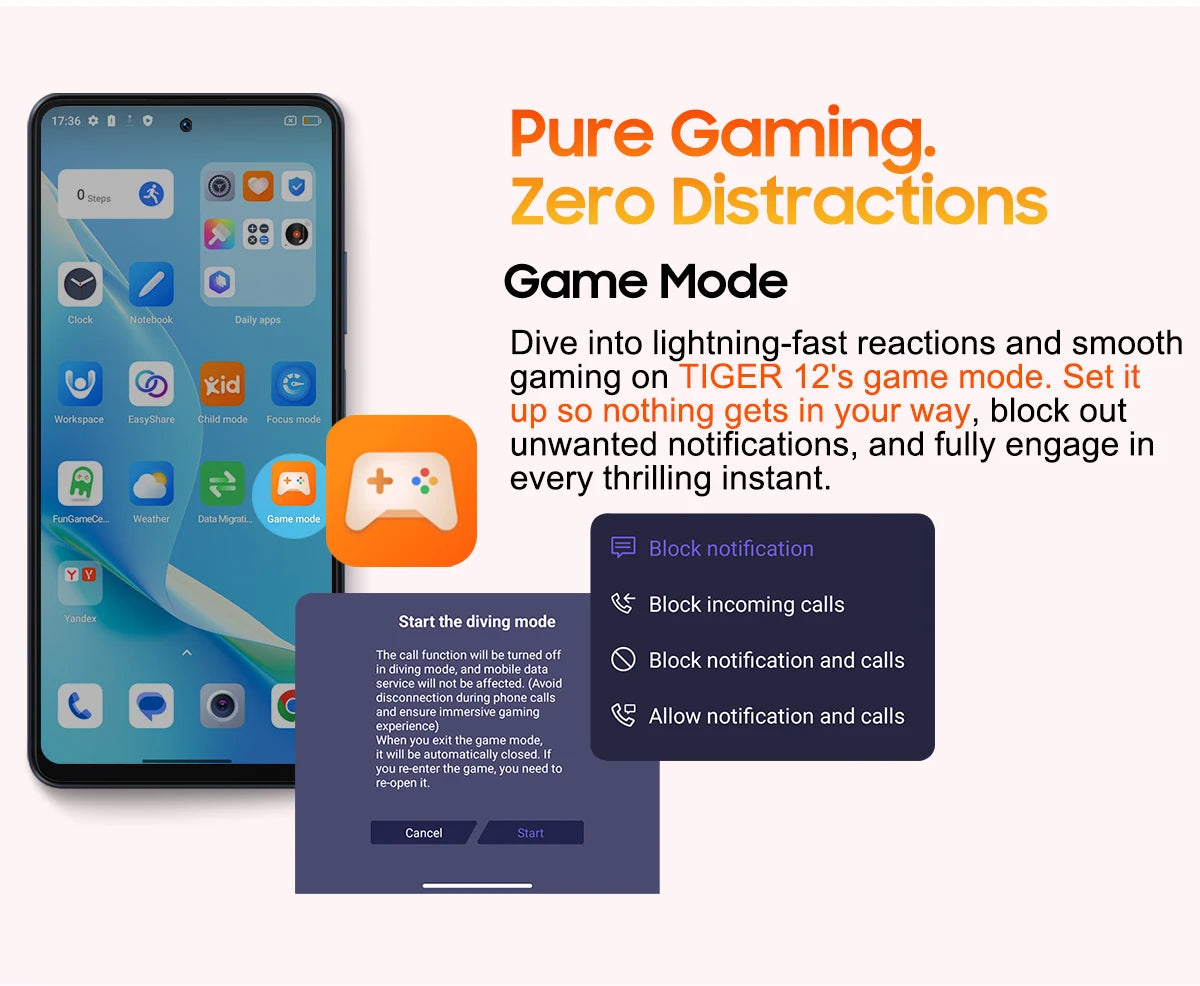 Dive into lightning-fast reactions and smooth gaming on TIGER 12's game mode. Set it up so nothing gets in your way, block out unwanted notifications, and fully engage in every thrilling instant.